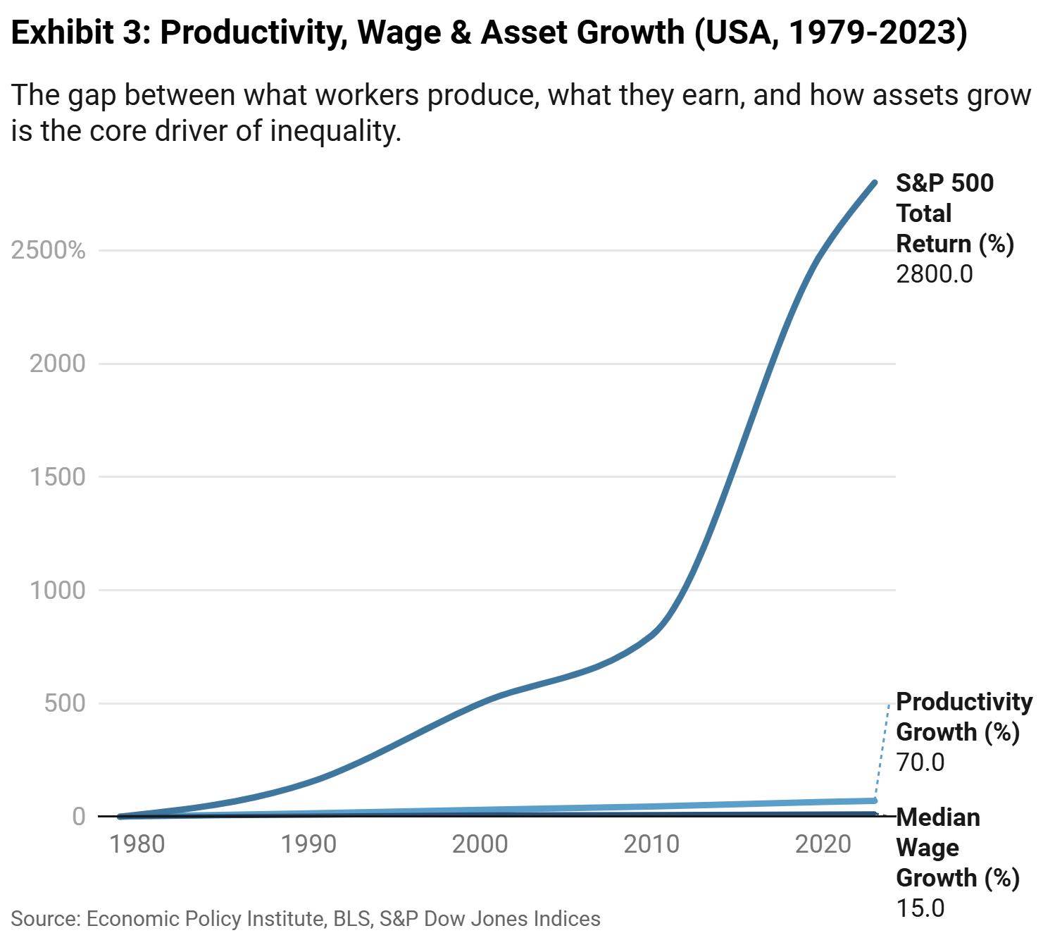 Between 1979 and today, U.S. worker productivity has grown by nearly 70 percent, while inflation-adjusted median wages have risen only 15 percent. Over the same period, the S&P 500’s total return has climbed more than 2,800 percent. Those who owned assets became far wealthier. Those who relied on wages stood still or fell behind, especially once the rising cost of housing, healthcare, and education is factored in.