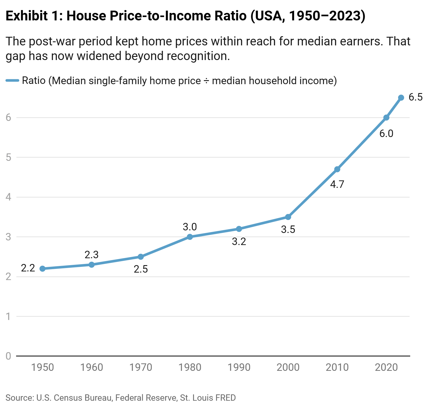 After the Second World War, the average U.S. home cost roughly 2.2 times the median household income. Even into the 1970s, the ratio hovered between 2.5 and 3. Mortgage rates in those decades often sat between 7 and 10 percent, which sounds harsh by modern standards. Yet the principal cost of a house was low enough that ownership was still within reach. A single-income household could secure a mortgage and expect to pay it off in under 20 years.